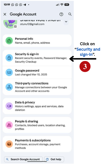 This takes you to your main Google Account dashboard.3. Once in your Google Account, tap “Security and sign-in” in the left sidebar.